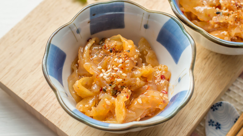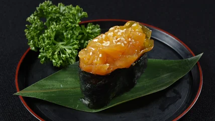 Not all jellyfish are edible. Only about a dozen varieties are safe to eat, and they must be thoroughly cleaned and carefully prepared to get rid of harmful bacteria. It is typically soaked in brine for a few days and dried before being served. The color can indicate freshness: Light yellow or white raw jellyfish is generally safe to eat, while darker yellow or brown indicates it may be unsafe for consumption. Keep in mind, however, that the soy sauce and other marinades restaurants add to jellyfish can alter the color. In addition to sushi rolls, jellyfish is often served in Japan as a dish called chuka kurage, which means seasoned jellyfish. This consists of strips of jellyfish cooked in sesame seeds or oil with seasonings such as red chili flakes.