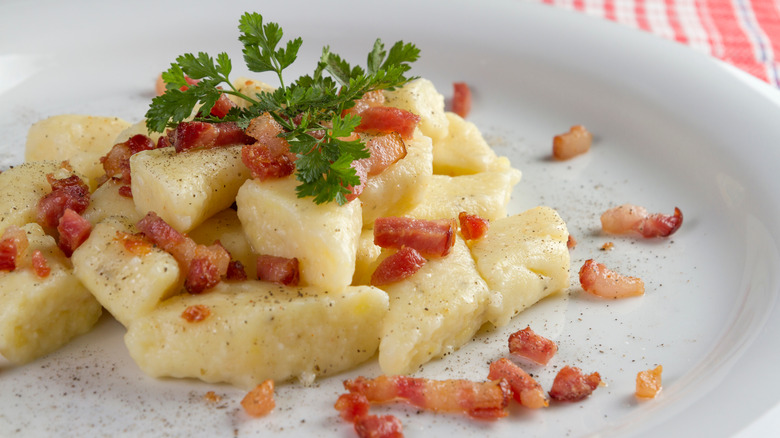 As a type of potato dumpling, no surprise that tubers are the dish's star ingredient. Take note that the color of the dumpling corresponds to the potato — as such vivid white varieties like Russet are preferred. Plus, this potato type contains more starch, which makes it easier to form and maintain the dumpling shape. To further bind the dish, kopytka's are formed with all-purpose flour, and an egg. Some salt and boiling water round out the ingredients necessary to prepare the dumpling's most basic version.
