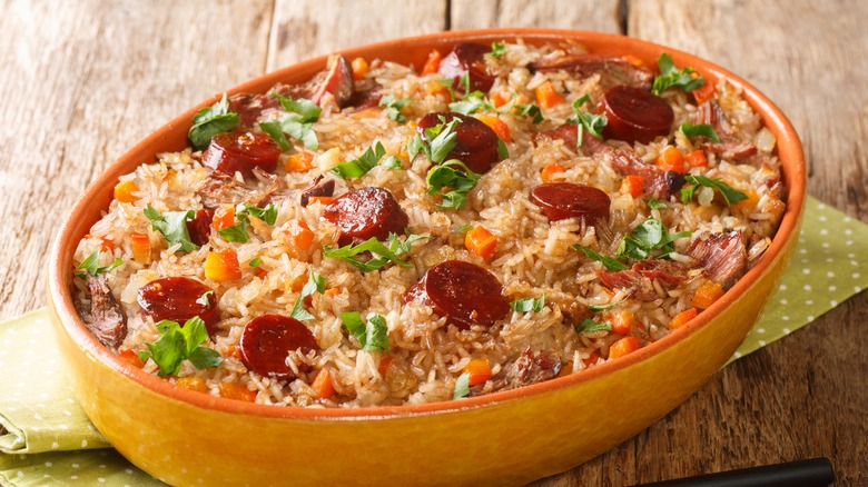 Sometimes called a pilaf or palov, plov is the national dish of Uzbekistan, a central Asian country bordering Turkmenistan and Kazakhstan. Like many rice dishes on this list, plov is as delicious as it is versatile. For that reason, you're almost guaranteed to see it served at weddings, parties, and other large events.