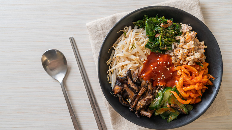 Some versions include marinated chunks of beef, but that's optional. What's not optional is the bibimbap sauce, a mixture of gochujang, sesame oil, soy sauce, mirin, and garlic. There are actually two versions of this iconic dish — the classic Jeonju preparation served in a metal bowl and the fancier hot stone dolsot bibimbap.