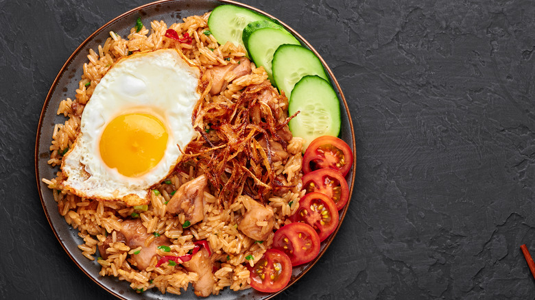 The ingredients may sound simple but don't go thinking this is just some other fried rice dish. Thanks to the kecap manis, the rice takes on a beautiful dark brown color and the chicken develops an irresistible caramelized exterior. After the chicken and rice are pan-fried, they're served alongside a fried sunny-side-up egg, sliced cucumbers or tomatoes, and a protein such as chicken satay skewers, ham, or shrimp.