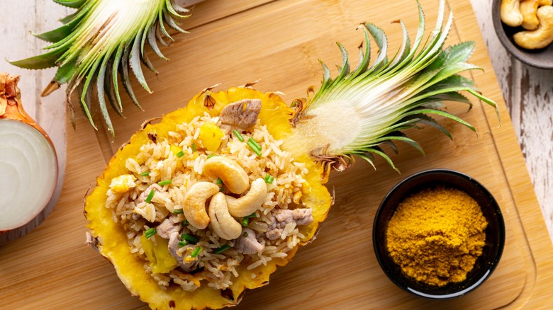 Thai cuisine is all about combining salt, sweet, sour, and spicy ingredients. Unsurprisingly, you'll find all of these notes present in pineapple fried rice. This scrumptious dish incorporates coconut-infused jasmine rice, pineapple chunks, cashews, eggs, a protein (shrimp, chicken, or tofu), and spices such as curry powder and white pepper.