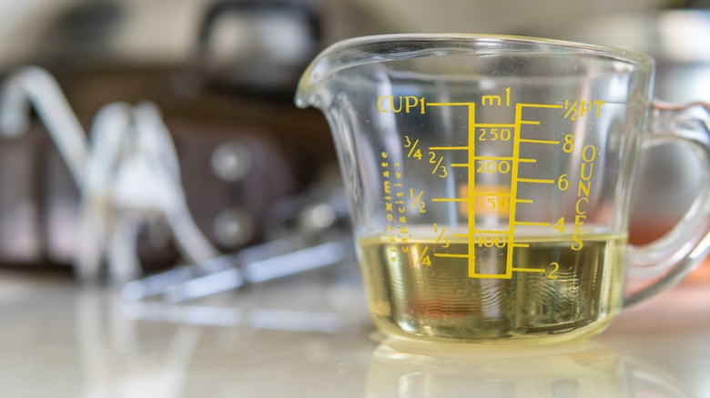 Liquid oils, such as vegetable or canola oil, should always be measured in a liquid measuring cup. Although both liquid and dry measuring cups hold the same volume of an ingredient, the liquid cups allow the baker to see the bottom of the meniscus (the curve of a liquid). In a dry measuring cup, you're just filling it until it reaches the rim of the cup — or inevitably spills over.