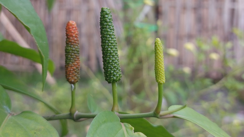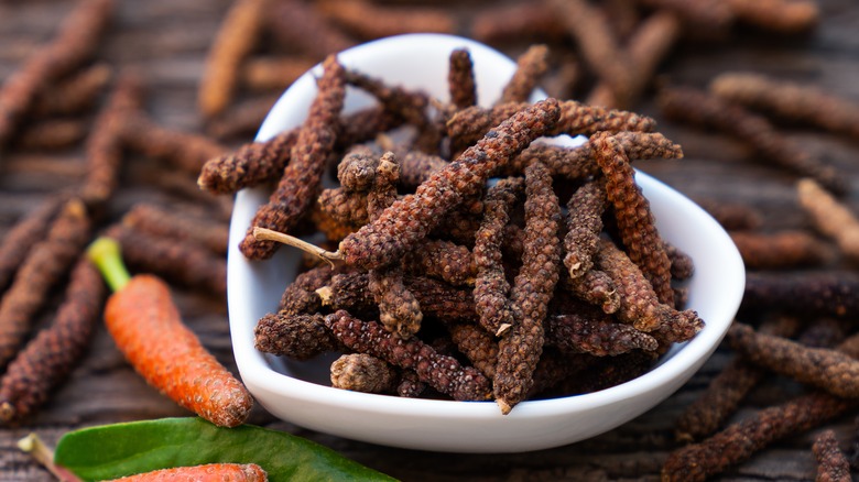 Unlike black peppercorns, long peppers aren't round. Instead, they resemble the dangly tree flowers called catkins. However, though they are flowers, long peppers come from a creeping vine native to India's northeastern state of Meghalaya. Each flower spike contains tiny fruits about the size of a poppy seed, and are typically sun-dried after harvesting before being used whole or ground.