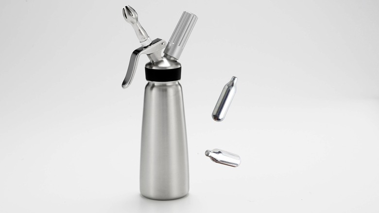 To be clear, we aren't talking about empty Reddi-wip cans or tiny silver whippet balloons here. We mean the professional-grade, refillable whipped cream canisters you might spot in bakeries, kitchens, or coffee shops, like this model by SimCoker. It has a wide enough mouth to allow bartenders to easily add all the ingredients — plus ice cubes — into the can.
