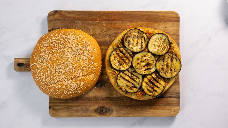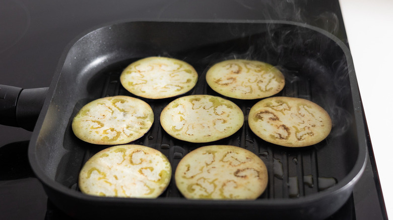 Set a grill pan on a burner turned to medium-high, then drizzle in the rest of the olive oil. Plunk some eggplant slices into the pan and grill them on the first side for 2 minutes, then flip them over onto the other side. The eggplant is done when it's tender and a little bit charred, with Douglas explaining that char "provides a wonderful subtle smokiness." Be careful not to burn the eggplant though, as too much char could turn the vegetable bitter instead. In order to avoid over-crowding the pan, you may need to work in batches to cook all of the eggplant.