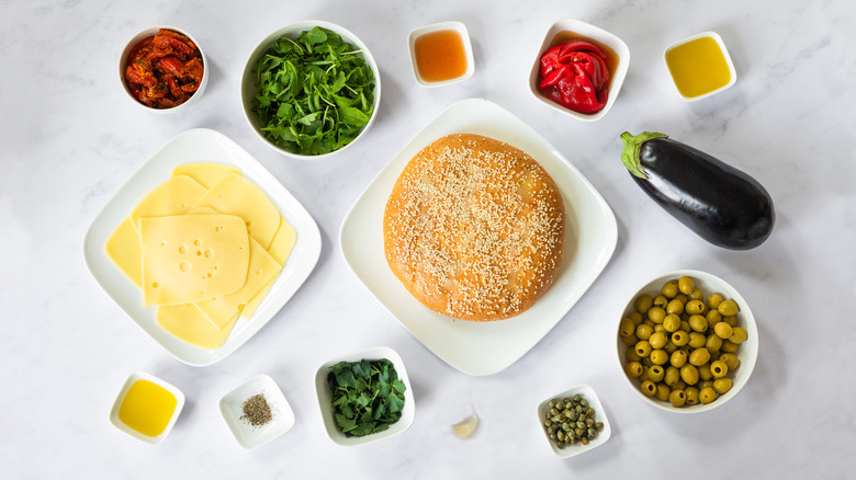 Collect the ingredients for this vegetarian eggplant muffuletta