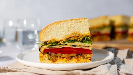 Douglas enthuses that this vegetarian sandwich is "bursting with vibrant flavor" and eye-catching colors. "For me, the beauty is in the incredible balance of bold flavors," she says. "We have the salty, fresh deliciousness of the olive salad; creamy, nutty Jarlsberg cheese; and sweet roasted red peppers." Douglas also calls eggplant a wonderful alternative to cured meats in muffulettas, not only because of its nutritional properties, but also because of the smoky flavor it takes on when grilled.