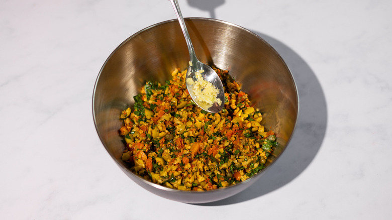 Chop the olives, tomatoes, parsley, and capers. Don't worry about getting too fine a dice with any of these (particularly the capers, which are already tiny), as Douglas says a rough chop will work fine. Once these ingredients are chopped, stir in the garlic, which should also be peeled and minced, along with the pepper, vinegar, and 1 tablespoon of olive oil.