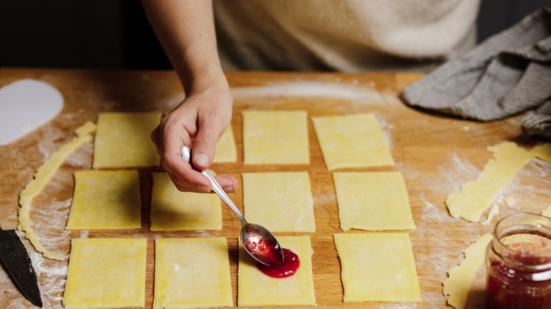 Start by rolling the dough out into a sheet and slicing 3-inch by 4-inch rectangles. You'll need two for each pop tart. You'll also need to apply a thin layer of water to the edges of the pastry to ensure the layers stick together. Then, fill each with your chosen filling. We recommend fruit preserves; strawberry, peach, and apricot all work well and complement the thin, sweet glaze you will put on top of the pastry after baking. For the ideal color, add an egg wash to the dough and allow it to cool completely before glazing. This glaze must include corn syrup to help it set at room temperature — a quintessential component of the pop tart pastry.