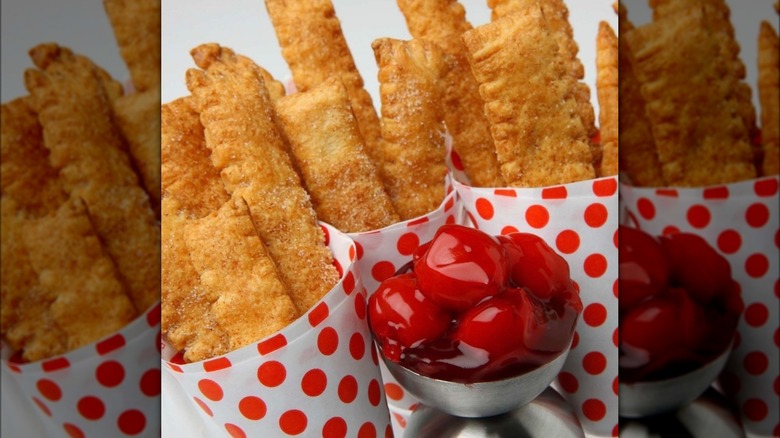 To make an easy, snack-able treat for the rest of your pie dough, you'll want to check out pie fries. They're just like the cinnamon sticks you can get from your local takeout pizza joint. And it can't be any easier than cutting your pie dough into strips, brushing it with melted butter, and covering it with cinnamon sugar. Once it's finished baking, you'll have perfectly dippable, sweet sticks to add to your favorite jam or icing. Alternatively, you can fry the raw dough in shallow oil and toss in cinnamon sugar or powdered sugar for a crispier pie fry.