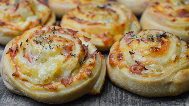 Start by rolling the dough out into a rectangle and cover it with a layer of pizza sauce. You'll want to sauce close to the edges to ensure that every pinwheel has a little bit of sauce on all sides of the dough. Then, cover the dough with cheese (shredded tends to roll better than whole chunks of mozzarella) and your favorite toppings. Once your dough has been prepared, roll it tightly in a log and slice the pieces with a sharp knife or unflavored dental floss — just like a cinnamon roll. From there, you can bake the individual rolls on a baking sheet and serve as an appetizer at your next gathering or party. You won't miss having slices of pizza ever again when you have this more fun option.