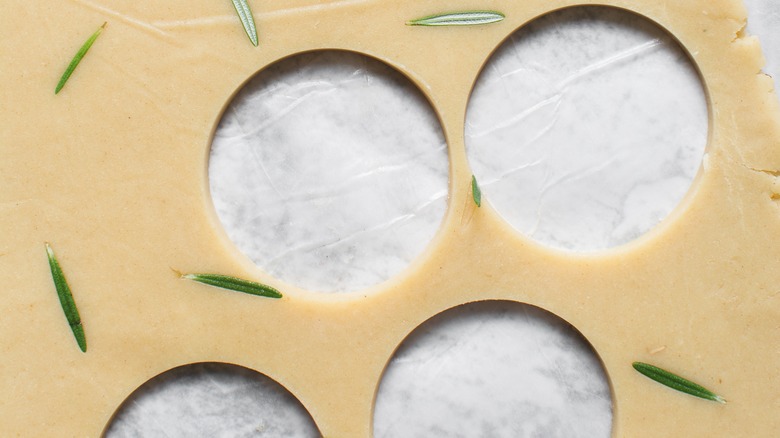 Start by rolling the leftover dough scraps into a ball and refrigerating the dough with plastic wrap. When you're ready to bake, roll the dough out and cut out the cookies with cutters or the rim of a glass. To ensure the cookies stay flat rather than puffing up, poke each a few times with a fork. Then, you can add an egg wash to each of the cookies and sprinkle sanding sugars or spices like cinnamon and nutmeg. Alternatively, you can also make a savory cookie by integrating some rosemary or herbs into the dough before rolling it out.