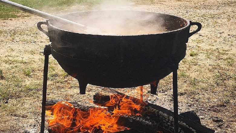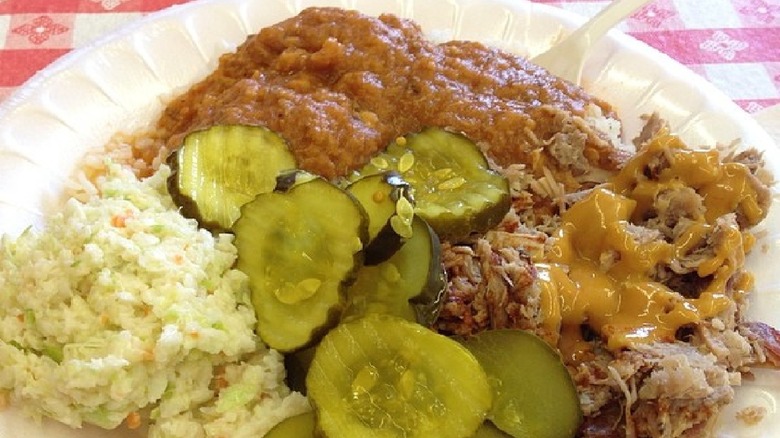 After returning to the stove, it's time to season the dish. Black pepper, apple cider vinegar, and mustard — often in the form of regionally popular barbecue sauce — are stalwart ingredient additions. Other flavors include ketchup, hot sauce, secretive spice mixes, and butter or margarine for thickness. The result is cooked down to a dense consistency with a texture that won't spill when poured over rice. Satiating and full of flavor, it's an unmissable barbecue classic that showcases South Carolina's cuisine at its best.