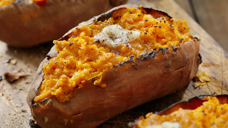 The only thing better than the spicy-sweet kick and nutrition-packed punch this dish delivers is how simple it is to make. Just preheat your oven and set out a stick of butter to soften at room temperature (one stick can take on 4 potatoes). While your butter softens, you'll want to prep your 'taters: giving them a quick wash, poking them on all sides with a fork, and wrapping them in foil before loading them into an oven set to bake at 425 degrees Fahrenheit for 45 to 60 minutes. (Unless you cut your cooking time in half with this simple trick). While this works well on just about any kind of sweet potato (and any other potato variety), it's especially tasty on Korean sweet potatoes aka goguma, which are yellow in color and have a faintly chestnut taste.