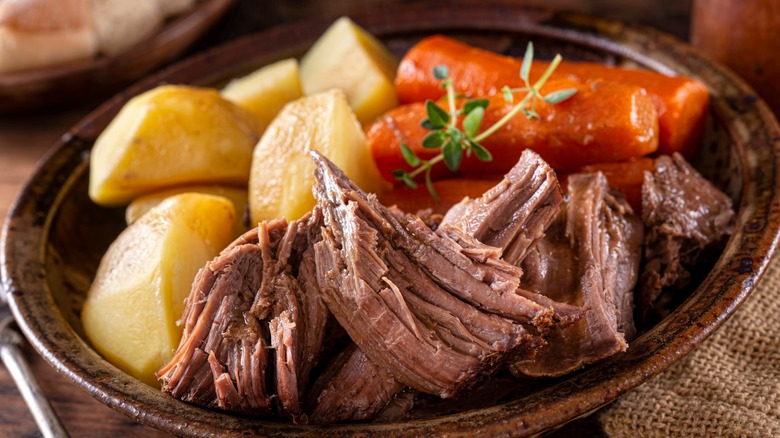 Pot roast is an enduring standard in American cooking. Whether you enjoy the homey nostalgia or no-fuss practicality, this meaty melange offers plenty of beefy bang for your buck (especially when you have the perfect cut of meat). If you really want to get the most out of this beloved dish (and you have a little more time for the fuss), Martha Stewart's method for cooking pot roast in less liquid yields an ideally flavorful roast. Her tip — braise it with a bit of sauce.
