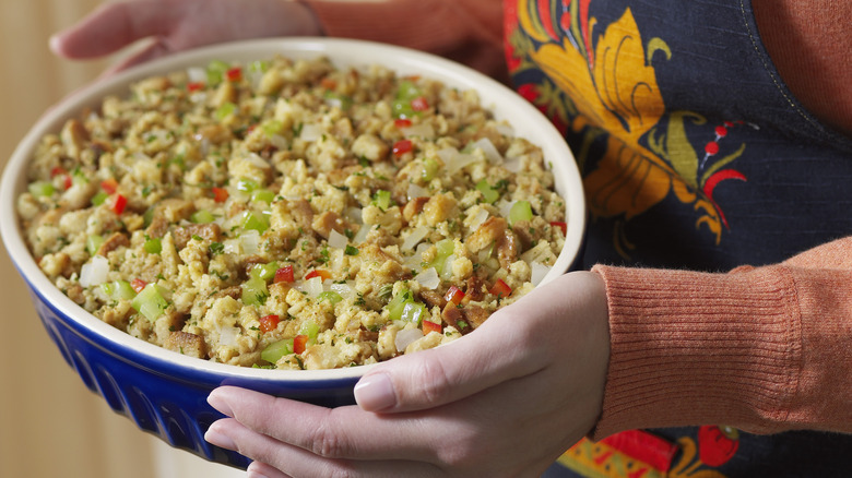 She then mixes the stuffing with her favorite seasoning — garlic powder — and vegetable broth. To help bind the stuffing ingredients together, Brown adds a drizzle of vegan butter to the pan before baking it in the oven.