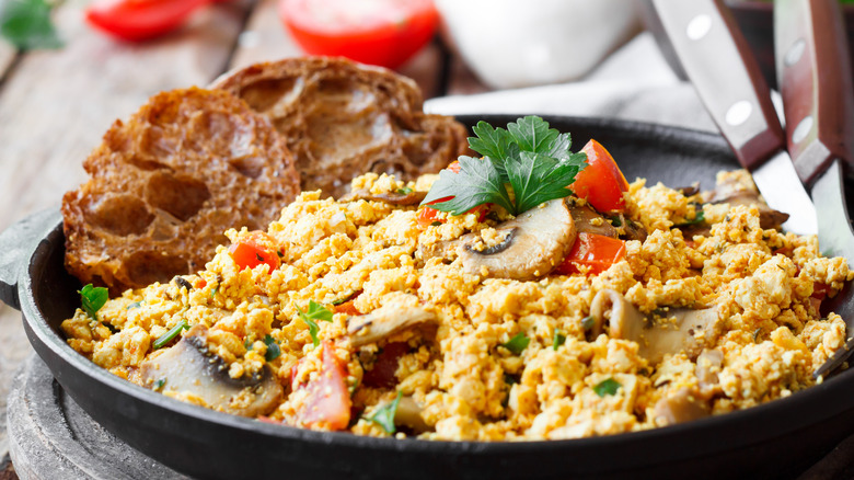 Tabitha Brown offers a lot of breakfast-for-dinner content on her TikTok page, including a recipe for a skillet dish made with layers of red potatoes, shallots, and mushrooms. Brown keeps it simple by adding in some vegan folded egg pieces, vegan sausage, and chopped spinach.