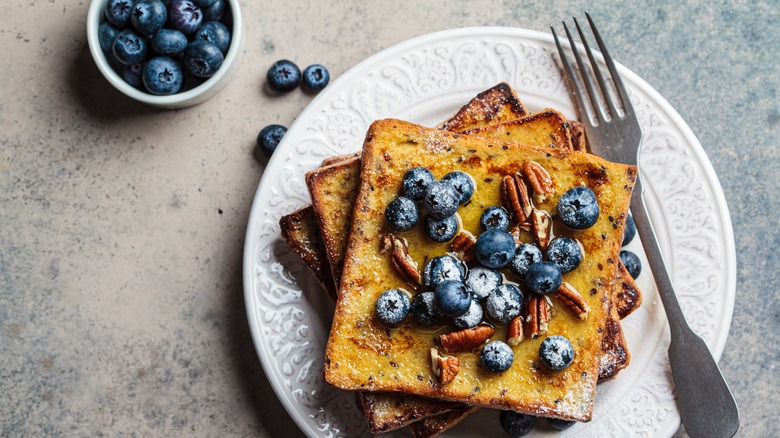 This product is made with mung bean protein and contains no animal products. She uses vegan raisin bread coated with JUST Egg and cinnamon-nutmeg-chia seasoning. Once the bread is cooked until golden brown, she covers the slices in powdered sugar, sliced banana, and syrup.