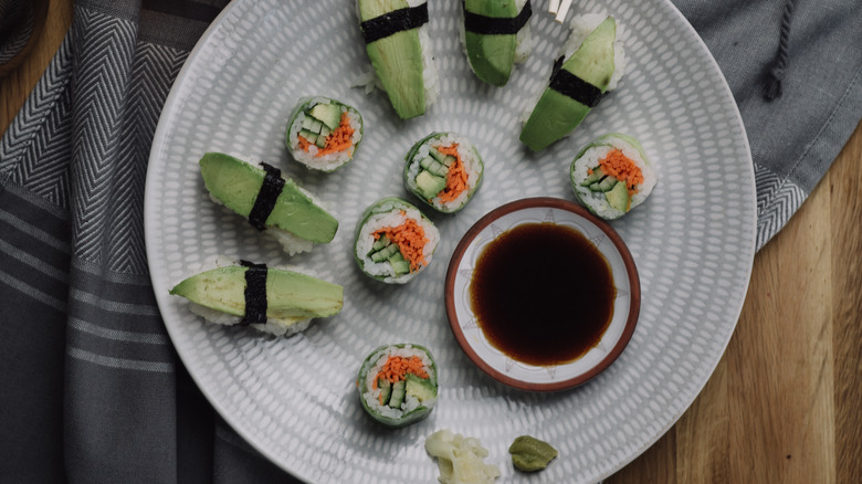 While you can eat vegan sushi with just avocado and cucumber, Tabitha Brown has found a way to upgrade sushi with a fish replacement. Her rendition of a vegan spicy tuna roll includes carrot pulp mixed with vegan mayo, nori furikake, and chili garlic sauce.