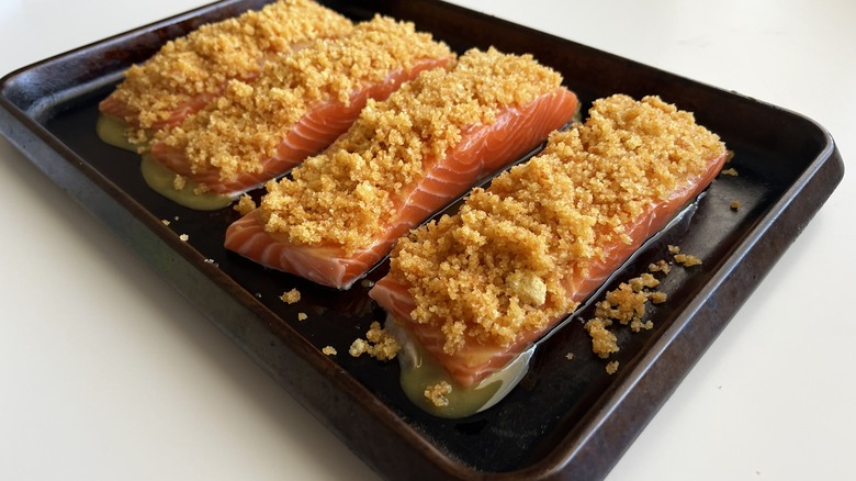 Courtesy of Tasting Table recipe developer Tess Le Moing, you'll get to enjoy a crispy topping as you savor this flavor-packed fish. Le Moing shares, "I'm part French (born in Paris) and brioche is like part of my food DNA, so this combo is such a fun French spin on the usual panko-crusted salmon we all know and love." While she concedes that "It takes a bit more work," ultimately she notes, "that's what makes it special." Skip the panko for once and impress your fellow diners with this delicious brioche-crusted salmon.