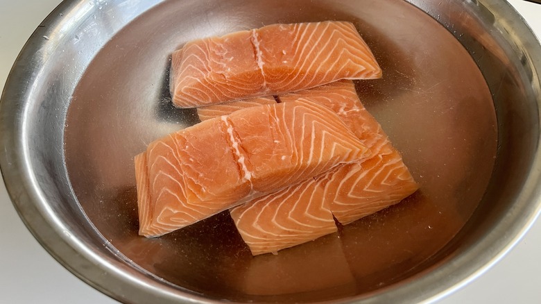 - Place the salmon in the brine and let it soak at room temperature for 15 minutes.