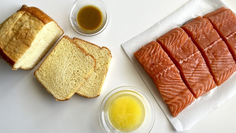 For this recipe, pick up a center-cut salmon fillet, then cut it into four evenly-sized pieces. Next, you'll need a couple of slices of brioche bread, salted butter, and honey mustard (either homemade or store-bought is fine, Le Moing notes). Melt the butter before you begin.