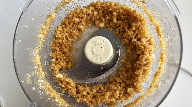 Next, add the toasted bread to the bowl of a food processor along with the melted butter. Pulse the mixture until it forms coarse bread crumbs.