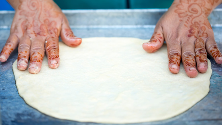 Msemen can be tricky at first, but once you get it, you'll be able to prepare them as quickly as pancakes — or at least, that's the goal. It starts out easy: Simply get your ingredients together for the batter and set aside some counter space for yourself. Then, start mixing the semolina powder, flour, sugar, salt, and yeast until you get a somewhat sticky ball of dough. So far, so easy — but this is where things get a bit more complicated. You're going to divide the dough into smaller pieces and start folding.