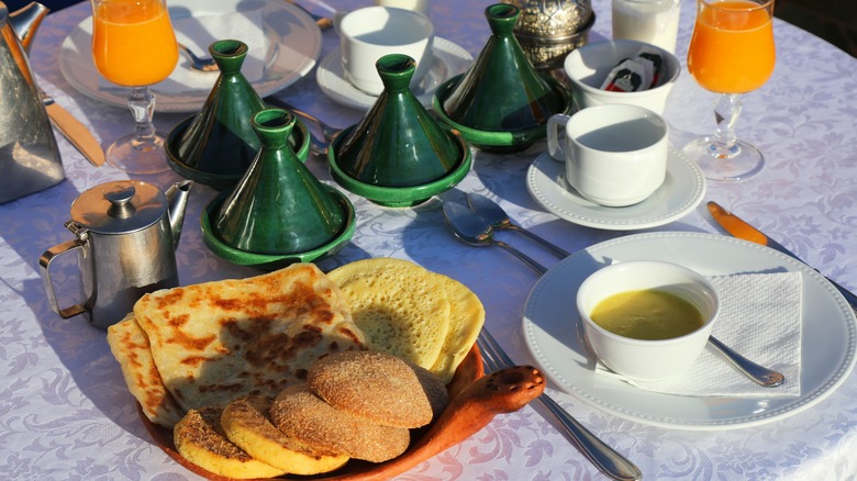 Also known as msemmen or rghaif in Arabic, msemen is a Moroccan-style crepe, only it's richer and flakier. The dough is folded like a puff pastry, flattened, and pan-fried to create delicate layers of flaky crepe paired with your choice of sweet or savory filling. They're very similar to Moroccan meloui, or malawi, but they're shaped differently — squarer rather than rolled into a coil. Msemen are often referred to as "Moroccan pancakes" — although some hand that title to beghrir, another Moroccan bread with a softer, spongier batter — because they're a treat as common on the Moroccan breakfast table as pancakes and waffles are in the United States. And if you're looking to spice up your own breakfast, msemen is well worth a try.