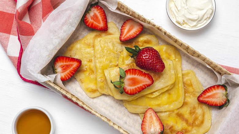 Like any other crepe, msemen can be served with everyone's favorite hazelnut spread, Nutella, along with your choice of bananas or berries. You could also get experimental with your own fruit syrups or jams by utilizing whatever's in season. Of course, there's also the possibility of going the savory route, for which cheese, meat, onions, and any variety of vegetables are always an option. You could even take inspiration from your favorite flatbread-style pizzas by adding everything from pepperoni and cheese to pesto and mozzarella. Regardless of which route you choose, the flaky texture of the msemen is sure to be life-changing — and you may never go back to your breakfast table without it.