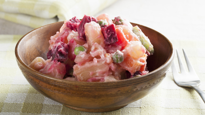 Like traditional potato salad, you'll start by steaming potatoes, then dicing them once they cool. Next, combine the potatoes with diced canned beets, celery, onions, hard-boiled eggs, and chives. Dress the vegetables with a combination of vinegar, Dijon mustard, olive oil, yogurt, and salt. Add some freshly ground pepper and serve immediately or chill for a few hours. Once again, the use of canned beets saves you at least an hour of preparation time when making this recipe.
