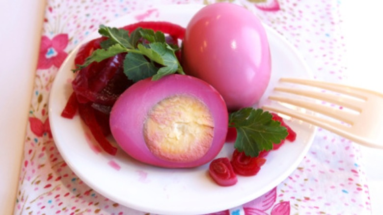 Start your preparations by hard-boiling and peeling eggs. Once cooled, plop them into a mason jar. From there, add two cans of whole beets to the eggs, making sure to reserve some of the beet juice. Bring beet juice, sugar, water, and vinegar to a boil and pour over the beet and egg mixture. Allow the jar to cool before refrigerating for at least 24 hours. When you pull the jar out of the fridge, you'll be greeted with bright pink, slightly sour eggs that are perfect for snacking on.