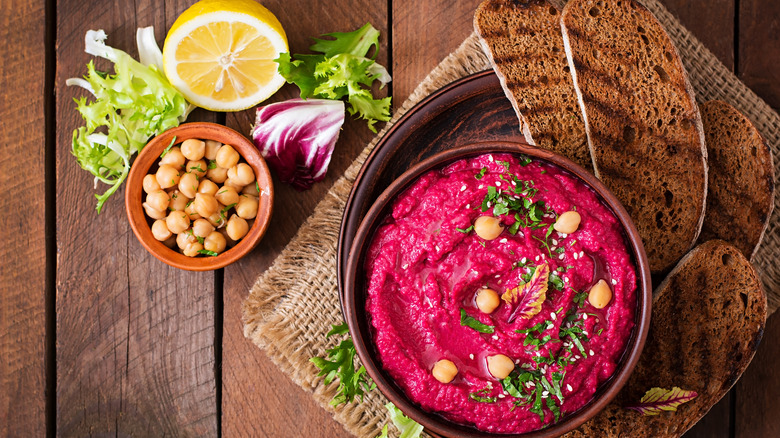 As with beet pesto, you'll notice that most beet hummus recipes call for roasted beets. While there's no denying that roasted beets are full of flavor, you can still stir up a tasty hummus with just the canned variety. After all, the ingredients are all getting mashed together otherwise, so why not save yourself some prep work? To make beet hummus from scratch, blend tahini, garlic, salt, and beets until smooth. Top with your choice of olive oil, pine nuts, and herbs. If you're in a rush, simply blend premade hummus with beets, olive oil, and balsamic vinegar.