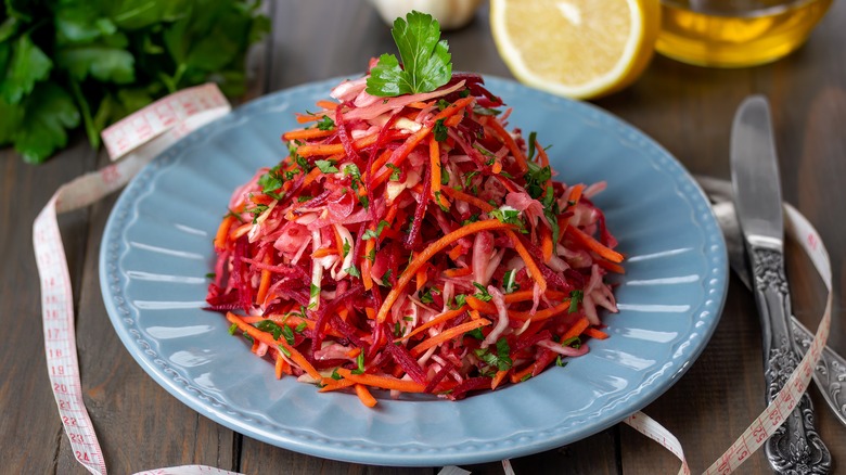 Our favorite beet slaw recipe combines sliced fennel, Granny Smith apples, parsley, and matchstick beets. Canned beets are perfect for this recipe because they're ready right out of the can — no need to deal with the thick skin and pesky greens. Once the base ingredients are chopped, it's time to make the dressing. All you need to do is whisk olive oil, lemon juice, orange zest, honey, salt, and pepper together. To assemble the slaw, mix all of the ingredients (besides beets) with two-thirds of the dressing. Use the remaining third to coat the beets. Add the beats to the other ingredients and stir a couple of times before storing.