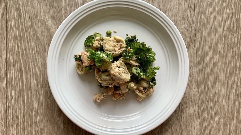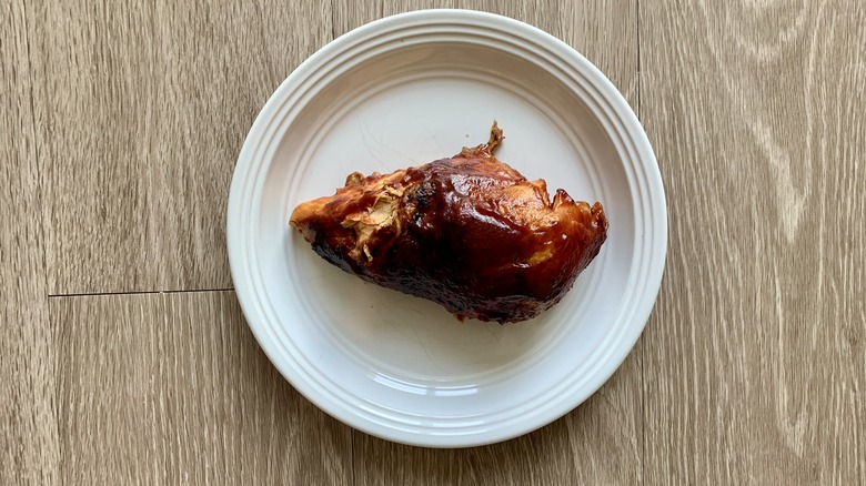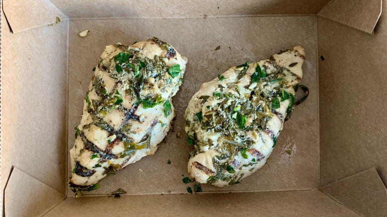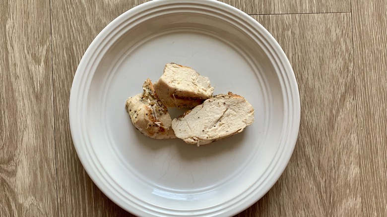 Naturally, it doesn't have the strongest flavor or most clickbait panache, not when there is literally just a handful of ingredients: Olive oil, chicken, salt, and pepper. It's refreshingly home-cooked, letting the inherent flavor of the poultry come through. Endlessly useful, you can easily throw this multifunctional protein source on lunch salads five days a week without complaint. It is the quintessential upgrade to anything from a well-dressed Caesar to a hearty Southwestern-style plate.