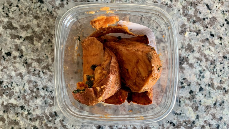 The most notable thing about the Whole Foods BBQ Chicken is the size of each hunk of meat. Seriously, it was huge, and this wasn't even the biggest piece available at the counter. You might not think of a take-out meal from the grocery store as something super hearty, but trust us, this will keep you full. If you love BBQ sauce, the meat is smothered with a thick, brick-red, sweeter-than-spicy layer of the stuff. It wasn't the best-tasting sauce we've ever tried, but hey, if you'd rather have just a hint of BBQ flavor than a mouthful, feel free to simply scoop it off.