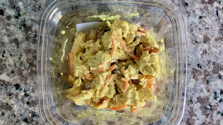 Whole Foods offers a few kinds of chicken salad, but the one that caught our attention was this orange-colored mix peppered with carrots, raisins, almonds, and green onions. It's also, crucially, flavored with curry. We had some doubts about how it would all come together, and the results were mixed. We'll give you the details so you can do your best to determine if you're on one side or the other!
