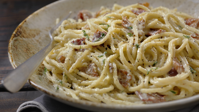 Last but not least, the legendary carbonara. Any trip to Italy wouldn't be complete without this famous pasta dish. Who would have thought that fresh spaghetti tossed with beaten eggs would create such an unparalleled sauce that stands the test of time? The Italians did, and they delivered. The pasta dish is complete with crumbled, crispy guanciale, Pecorino Romano cheese, and fresh black pepper. It would be easy to fool someone into thinking this dish was heavy with cream and butter, but the egg does the work of both those ingredients.