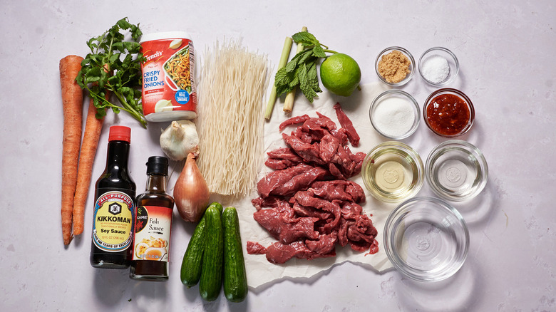 The main ingredients in this dish are the ones named in the title, these being steak (sirloin will do) and vermicelli. You'll also need a shallot, carrots, and cucumbers, as well as seasonings including soy sauce, fish sauce, lime juice, lemongrass, garlic, brown sugar, granulated sugar, salt, white vinegar, and chili garlic sauce. Grab some canola oil for cooking, along with cilantro, mint, and fried onions to use as garnishes.
