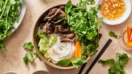 This Vietnamese noodle bowl, says recipe developer Michelle McGlinn, is called bun bo xao and is kind of like a cold salad version of pho. As she explains, "It uses the same noodles as pho and is garnished similarly with fresh, leafy, aromatic ingredients like mint and cilantro." The intent of this recipe, she says, is to make a light, nutritious dish that gets plenty of flavor from a tasty meat marinade, as well as a Vietnamese dipping sauce called nuoc cham that's used here as a salad dressing.