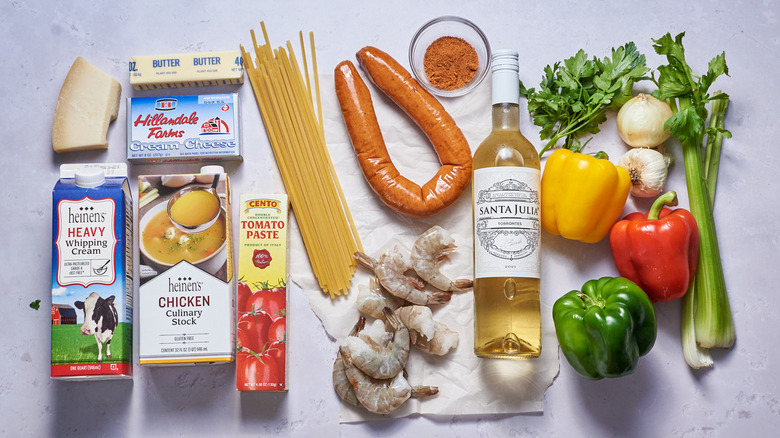 Besides shrimp, this pasta dish also contains sausage (andouille, in keeping with the Cajun theme). The preferred pasta shape is fettuccine, while the sauce is made with whipping cream, cream cheese, butter, tomato paste, white wine, chicken broth, and parmesan. The vegetables in this dish include the Cajun holy trinity of onions, celery, and bell peppers, while the seasonings include garlic, salt, and Cajun seasoning. (Want to DIY this last ingredient? Here's a recipe for homemade Cajun spice mix.) For a final touch, you'll be stirring in some parsley.