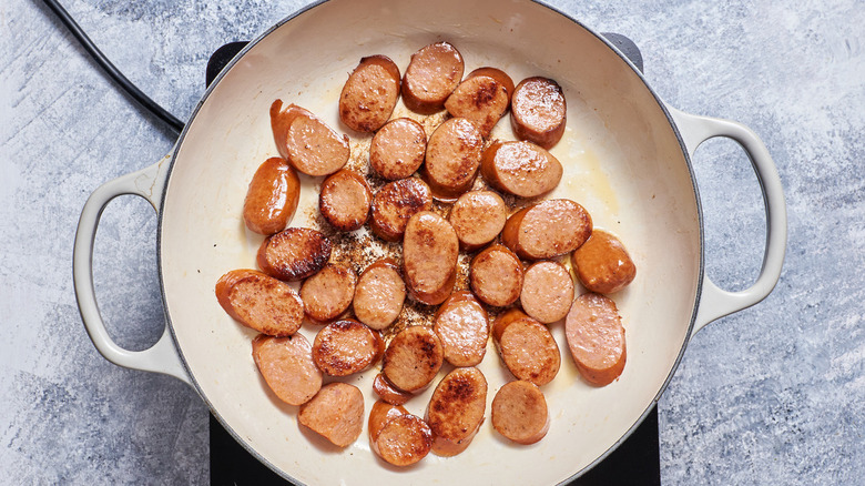 - Heat a thin layer of oil in a large, deep pan over medium heat. Cook the sausage until deeply browned on all sides, then remove it from the skillet.