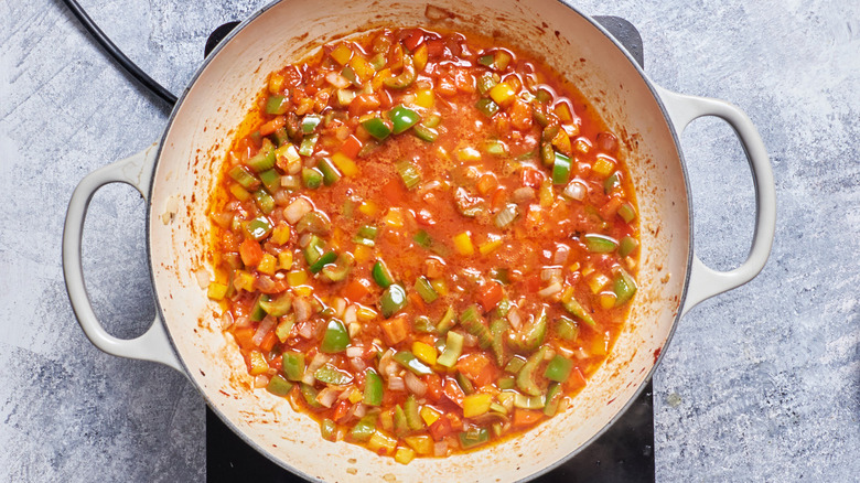 To make the pasta sauce, melt the butter in the same pan, using it to scrape up any browned bits left from cooking the sausage and shrimp. Cook the peppers, celery, onions, and garlic until the vegetables have softened, which McGlinn says should take about 5 minutes. Stir in the tomato paste and cook it for 3-5 minutes. Once it starts sticking to the pan, pour in the white wine, allowing it to deglaze the pan.