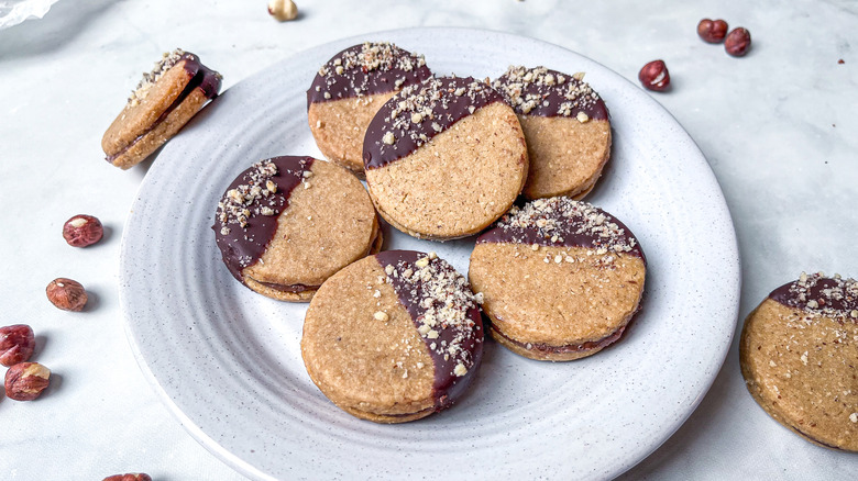 One by one, take the cookie sandwiches and dip them halfway into the chocolate. Sprinkle chopped hazelnuts over the wet chocolate and let the cookies sit on the wire rack for 30 minutes or until the chocolate hardens. Finally, per Case's suggestion, enjoy these cookies with some "freshly brewed coffee, a latte, or a glass of milk."