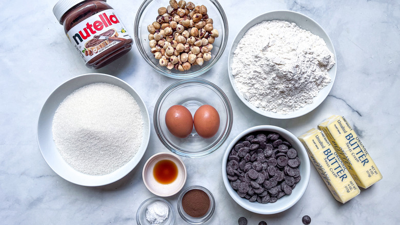 Next, you'll need standard baking ingredients: all-purpose flour, baking powder, salt, unsalted butter (softened at room temperature), granulated sugar, a whole egg and an extra yolk, espresso powder, and vanilla extract. Case recommends using King Arthur brand espresso powder but notes that "if you can't have caffeine, you can totally eliminate the espresso powder." Don't forget a jar of Nutella and some semi-sweet chocolate chips or a chopped chocolate bar.