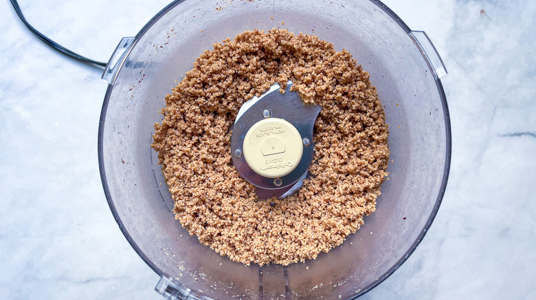 - Pulse the toasted hazelnuts in a food processor for about 30 seconds until finely ground.