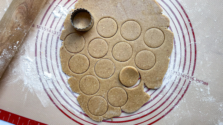 When the dough is sufficiently chilled, preheat the oven to 375 F. Line 2 baking sheets with parchment paper and let the dough sit out at room temperature for 10 minutes so it's easier to roll. Sprinkle a bit of flour on your counter and roll out the first disk until it's about ⅛ inch thick. Take a 2- to 2 ½-inch cookie cutter and cut out circles in the dough. Transfer the circles to the lined baking sheet, then roll out the second disk of dough and repeat. Once all the cookies are cut and placed on the sheet, bake them for about 10 minutes or until the edges start to brown.