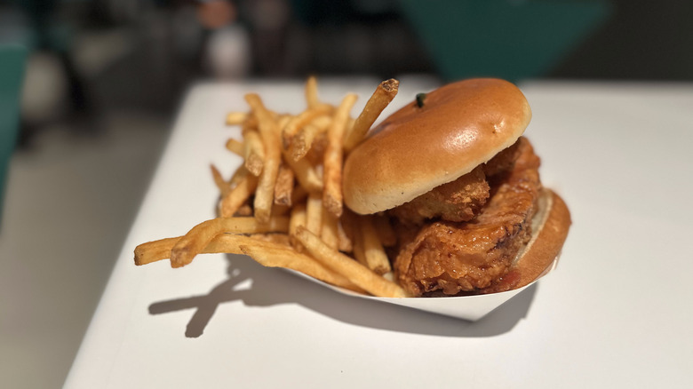 At the top of our list is the Terrifyin' Twice-Spiced Chicken Sandwich. Don't let its long, tongue-twisting name deter you — every bite is an explosion of flavors. A plump, spicy chicken breast — crispy fried and then draped in luscious hot honey — forms the ghoulish heart of this sandwich. Melted pepper jack cheese oozes over alongside nestled fiery jalapeno poppers. If that's not enough, crispy bacon strips add a smoky touch, ensuring this sandwich truly stands out.