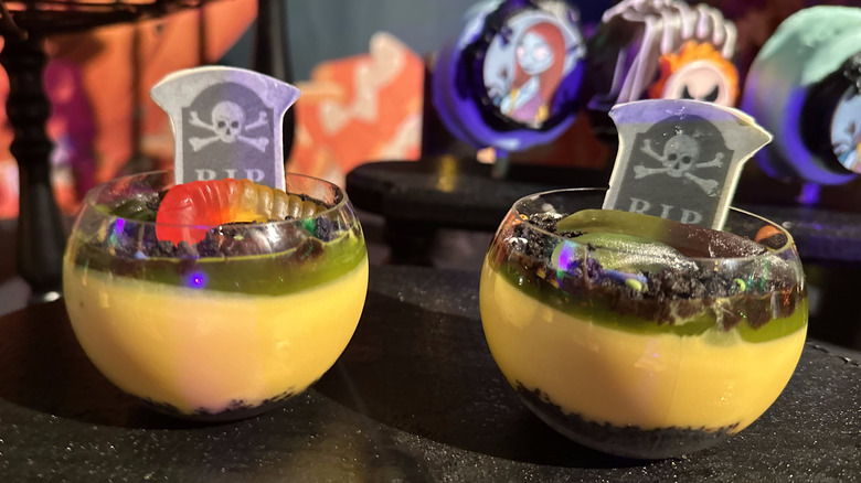 Young adventurers especially will be thrilled by this fusion of familiar and fresh. While the gelatin might tease with a hint of sourness, it's balanced out beautifully by the sweetness of the mousse beneath. It feels like the type of graveyard you might find inspired by the Pirates of the Caribbean, and given that the ambiance of this land has been taken over by pirate radio during the party, it's fitting.